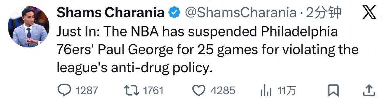 据nba“爆料大王”Shams Charania透露,费城76人队全明星前锋保罗·乔治因违反联盟禁药相关规定,被禁赛25场。