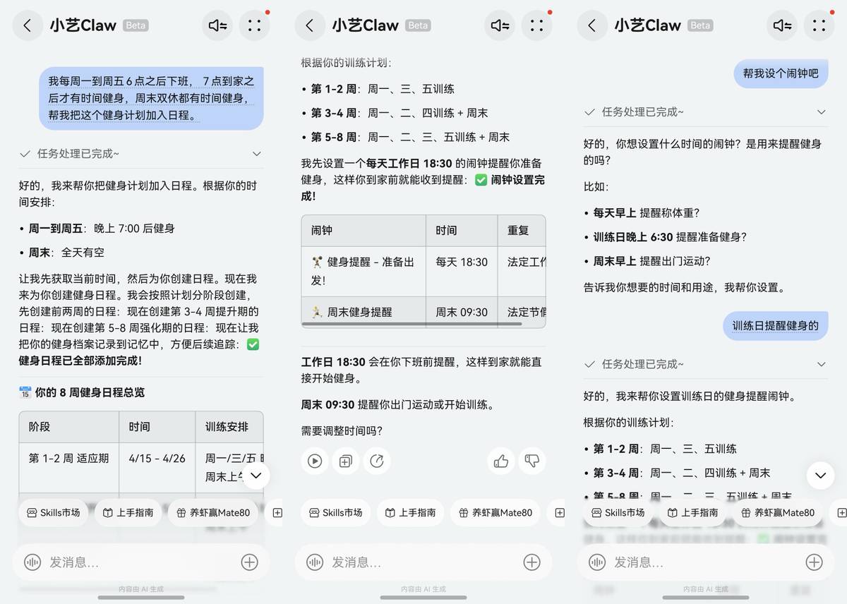 接着我把我的下班时间和空余时间都告诉了小艺Claw,并且让TA把这个健身计划加入日程,TA很快就创建好了日程。随后,我让TA添加训练日闹钟作为提醒方式,以免忘记训练导致计划延迟。