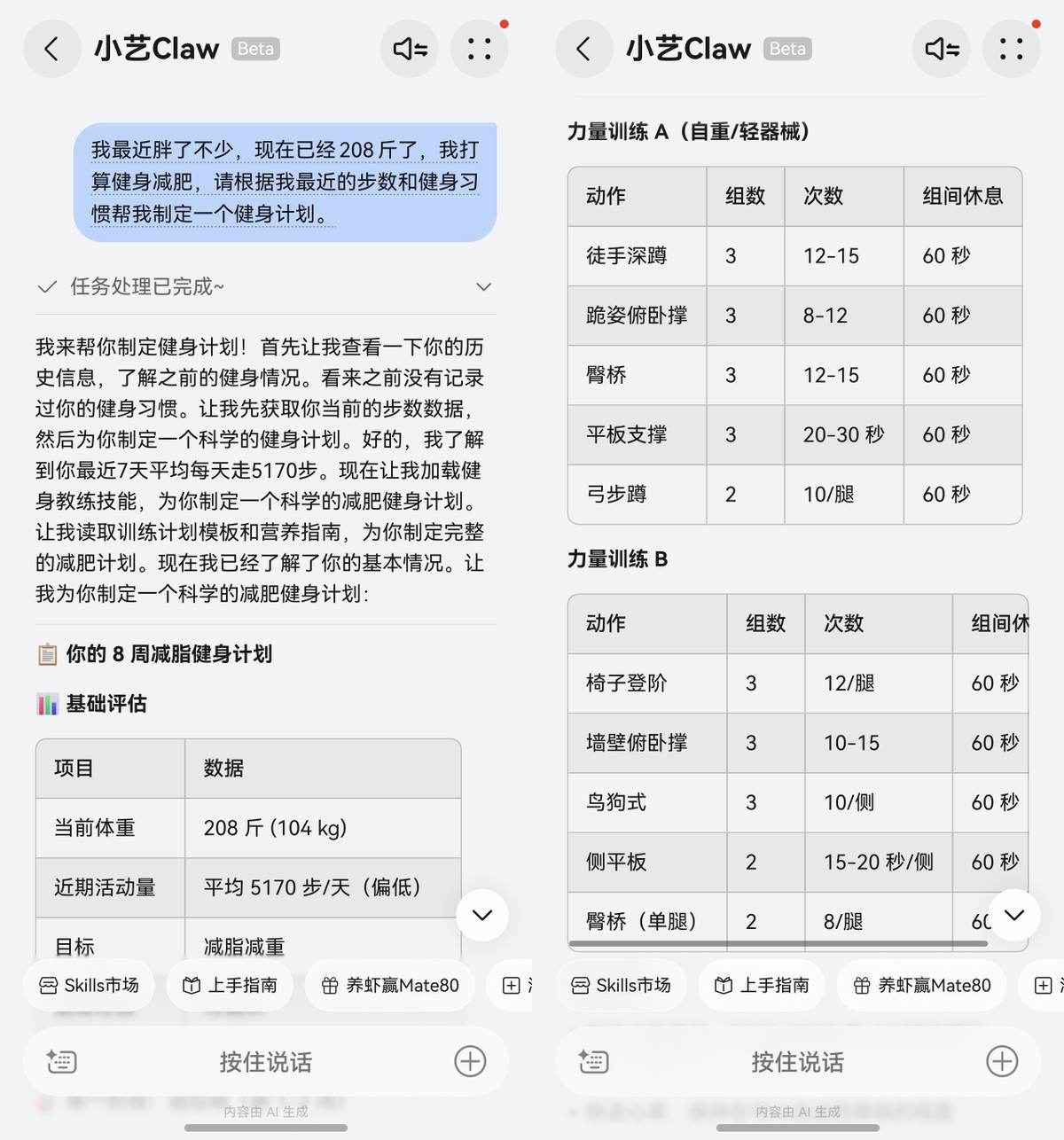 和别的AI助手不同的是,小艺Claw不仅不用安装配置环境,还自带四个人格,分别是默认人格、信息猎手、办公搭子和创作天才,大家可以根据自己的需要选择,打造自己的专属龙虾。初始人格设定是“默认人格”,我就选了这个,比较开放式。我最近胖了不少,打算健身减肥,我把需求告诉小艺Claw,TA立马帮我规划了一份横跨8周的减脂健身计划,还贴心地列出了动作项目、组数、次数和组间休息时间,既专业又周到。
