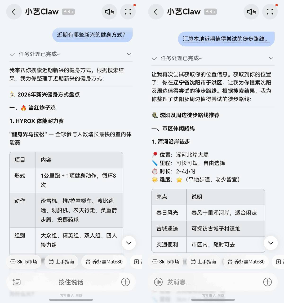 不仅如此,小艺Claw还有超强的信息检索能力,搜起东西来非常靠谱!比如问TA“近期有哪些新兴的健身方式”或者“汇总本地近期值得尝试的徒步路线”,分分钟TA就能帮我整理好。