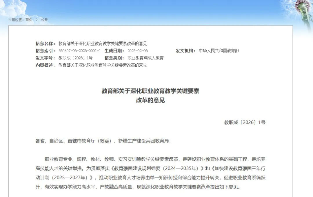 2026年2月,教育部发布《关于深化职业教育教学关键要素改革的意见》,三大动作: