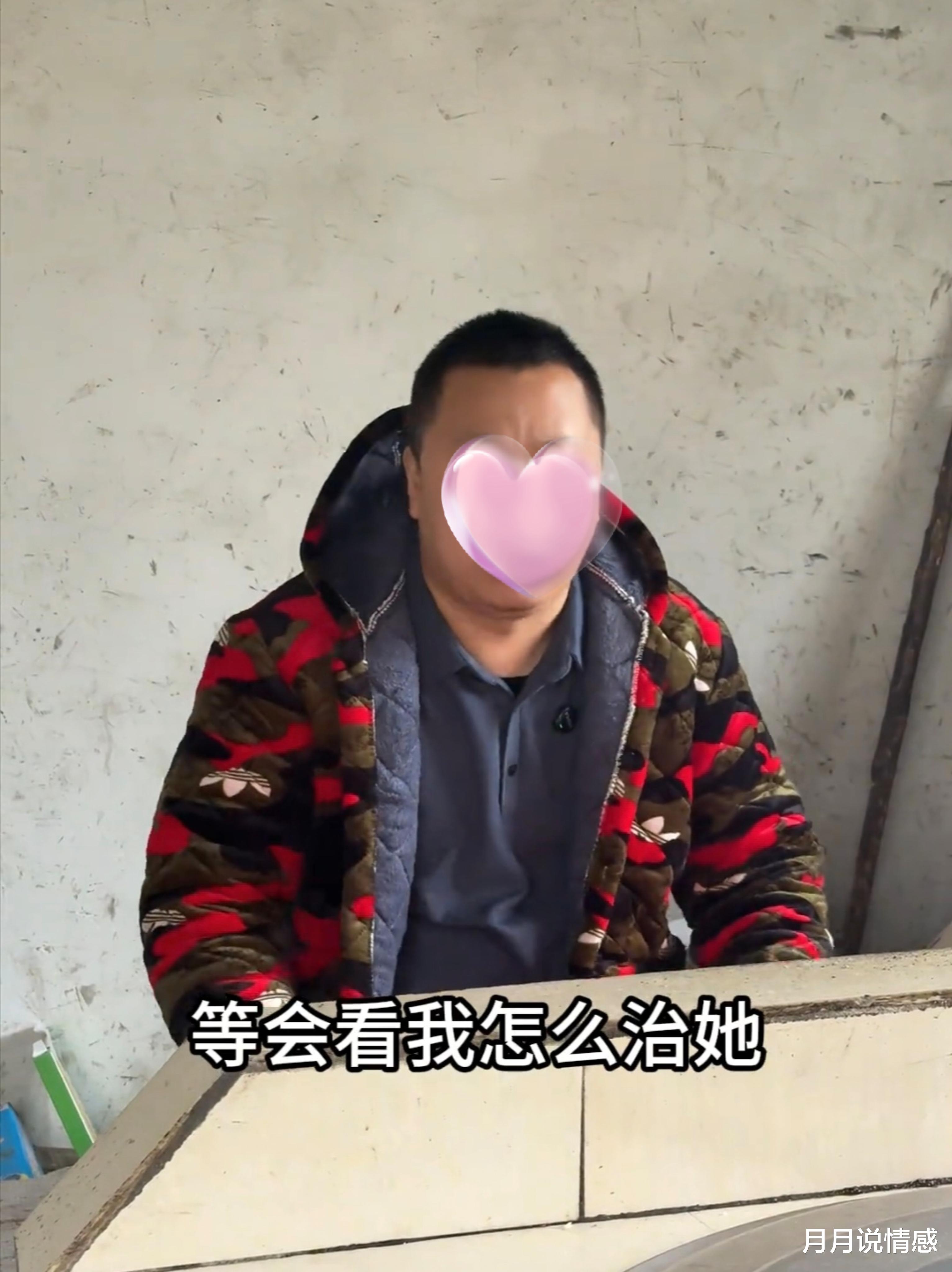 男子放下柴火,走到妻子身边,拍了拍她的肩膀:“老婆,你别生气,等会看我怎么治她。”他接过锅铲,让女子去休息,自己动手炖鸡。