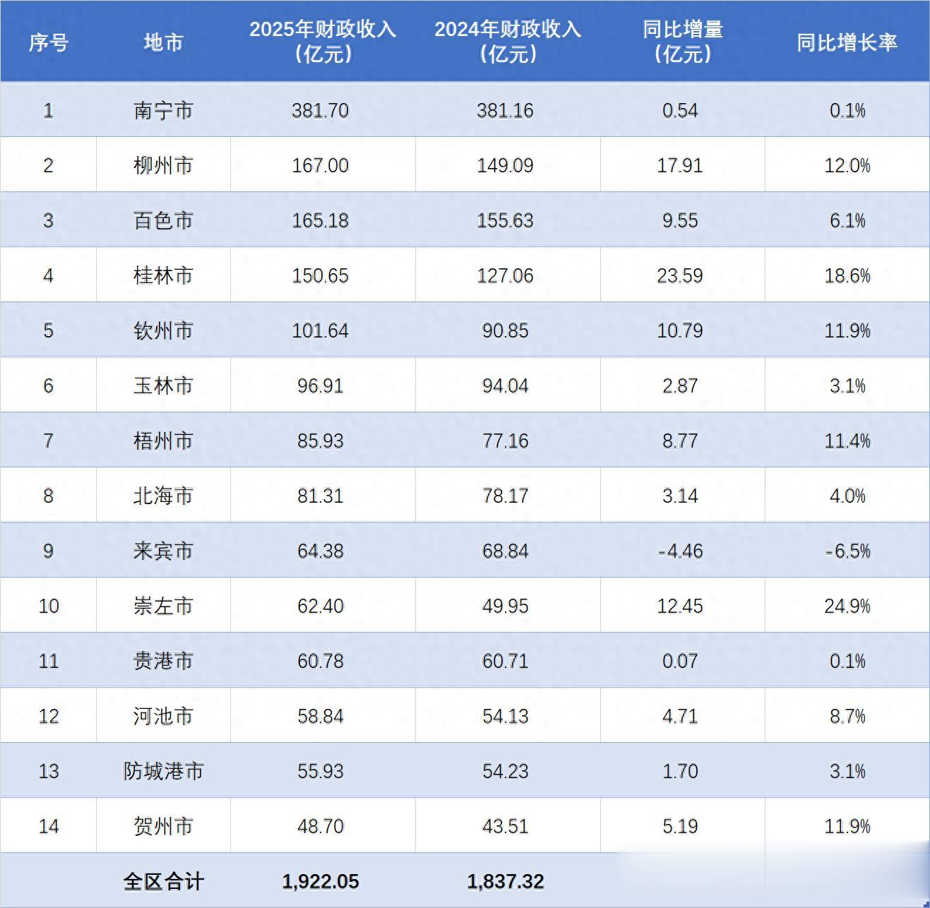 据统计部门公布的数据,2025年1-12月份,广西自治区共实现地方财政收入(一般公共预算收入)1922.05亿元,较上年同期增加84.73亿元,同比增长率为4.6%,增势稳健。其中地市收入合计1581.35亿元,同比增长6.5%。