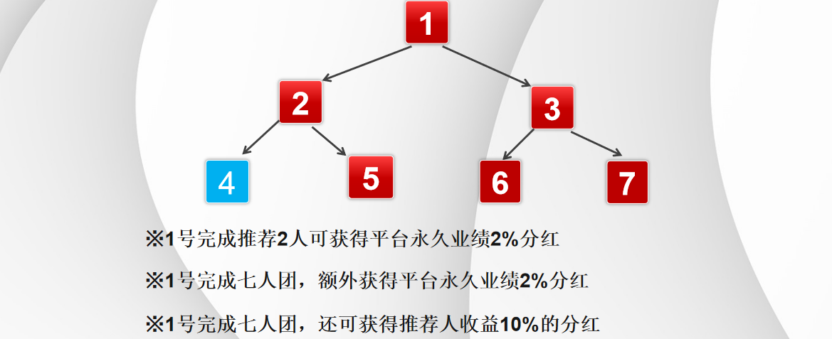 案例直击:1 号推荐 2 号、3 号,3 号推荐 6 号、7 号,叠加自动滑落的 4 号、5 号,1 号快速集齐七人成团,坐享 4 个点位的成团收益,躺赢毫不费力!
