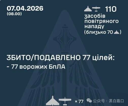4月7日,俄罗斯发射110架无人机袭击乌克兰多地,乌军击落77架俄罗斯为无人机,14个地点记录到撞击,9个地点有残骸落下。