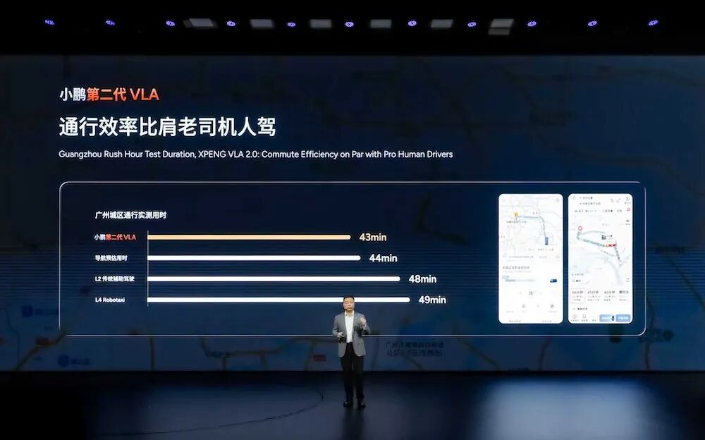 通行效率方面,根据官方评测,小鹏第二代VLA通行效率已经初步比肩人驾,实测用时比导航预估用时还要短,比L2传统辅助驾驶、L4 Robotaxi都要快。