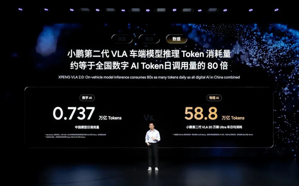 数据方面,小鹏第二代VLA车端模型推理Token消耗量约等于全国数字AI Token日调用量的80倍。