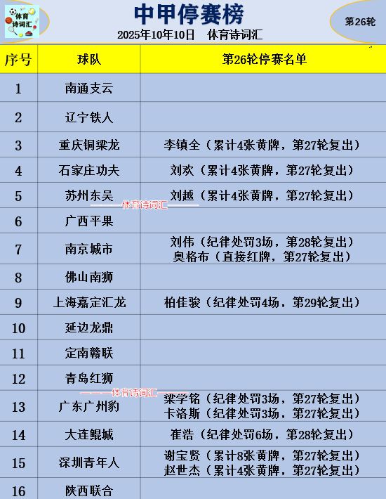 当中超、中乙还处于休赛期,当国足还忙于选帅之际,中甲则按照一周一赛的节奏稳步进行着,没有在双节或者国际比赛日前后休赛。本周中甲第26轮展开对决,冲超、保级形势越来越刺激,导致近几轮各队停赛球员数量居高不下。从赛季中期,每轮只有五六人停赛,到如今冲刺阶段火药味十足,动作更凶猛,使得近期轮次的停赛球员数量连续破双。