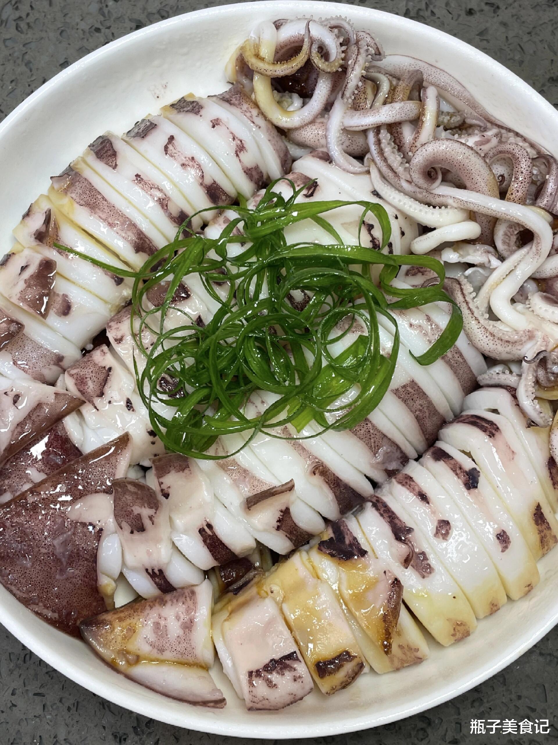 计时!:从鱿鱼下锅开始计时,精确到60秒!对,你没看错,就一分钟!看到鱿鱼片卷成花状,颜色从不透明变成洁白色,立刻、马上、毫不犹豫地用漏勺捞起!