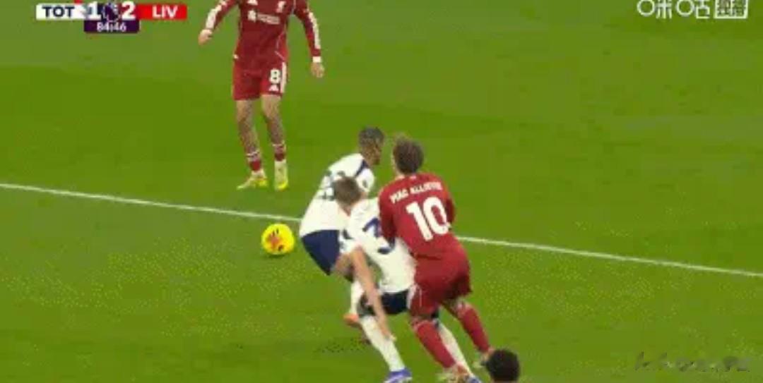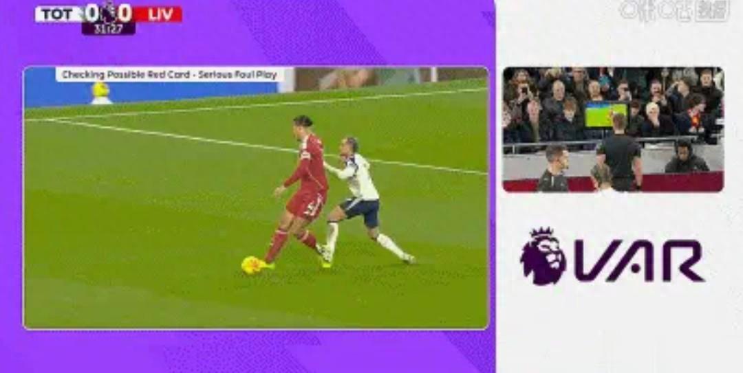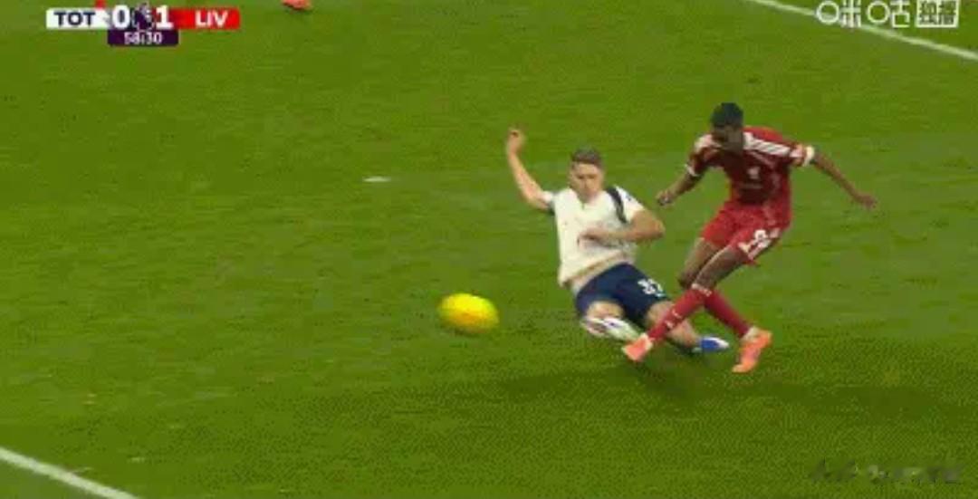热刺1-2利物浦本场比赛的转折点,必然是第33分钟哈维-西蒙斯的犯规,他在身后直接踩向国家队老大哥范戴克的小腿,随后被直红罚下。