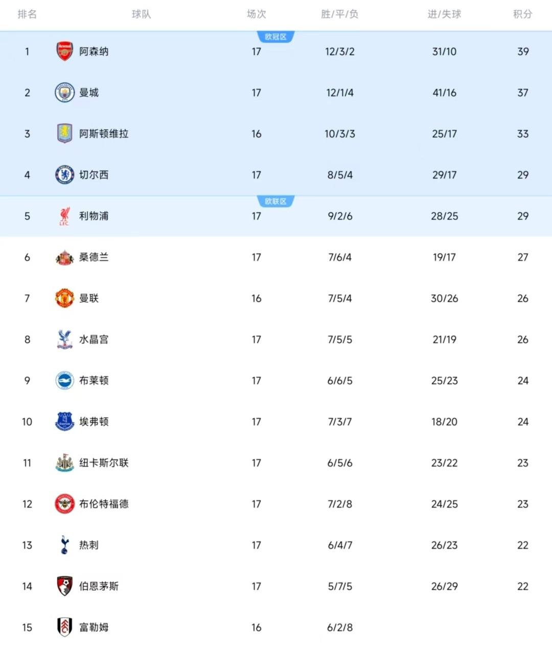 最终利物浦战胜9人热刺,曼城豪取英超五连胜,阿森纳一球小胜埃弗顿,切尔西则扳平纽卡,英超积分榜迎来更新。