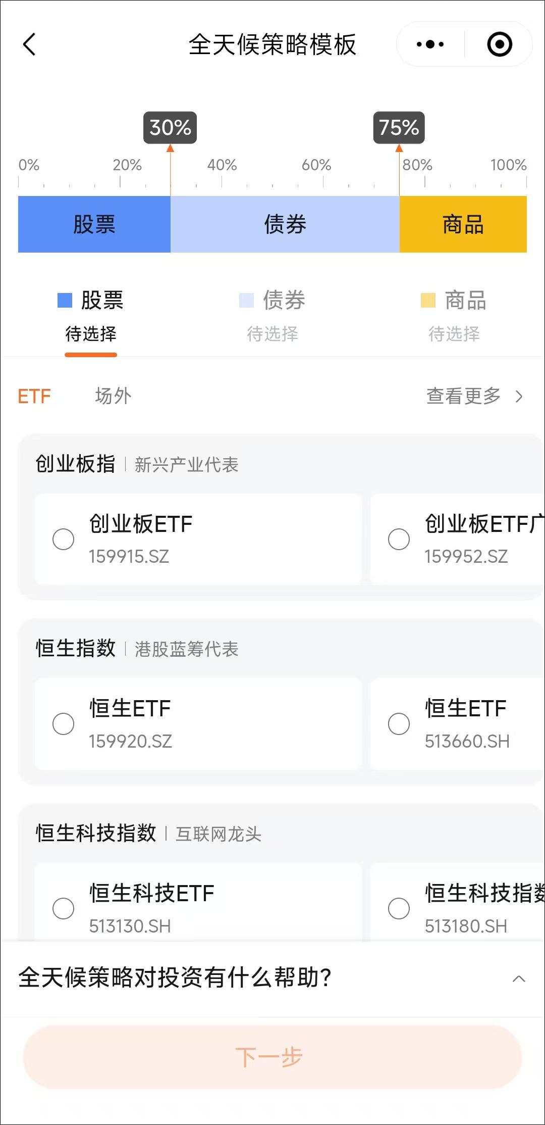 股债商每个大类下都精选了细分的ETF基金,敞口各异。非常友好!