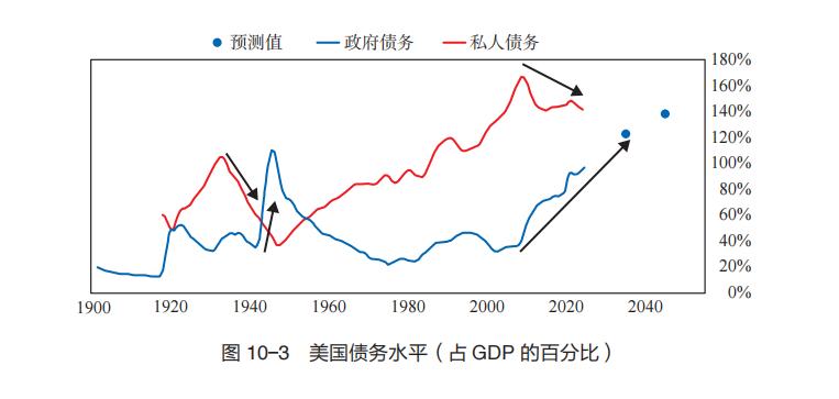下图分别展示了1900年至今,美国私人部门和政府部门的债务水平变化走势图: