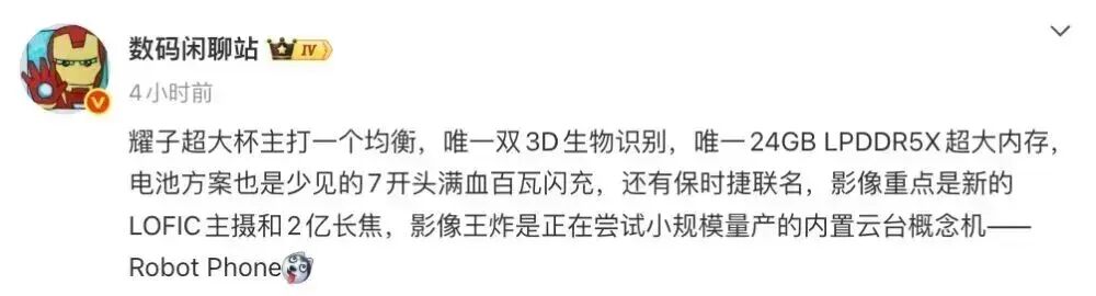 除此之外,博主@数码闲聊站 的另一份爆料显示,“耀子超大杯主打一个均衡,唯一双3D生物识别,唯一24GB LPDDR5X超大内存,电池方案也是少见的7开头满血百瓦闪充,还有保时捷联名,影像重点是新的LOFIC主摄和2亿长焦,影像王炸是正在尝试小规模量产的内置云台概念机——Robot Phone”。