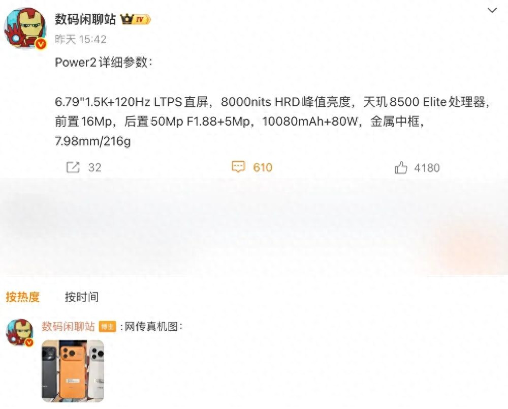 在此之前,博主@旺仔百事通 也在爆料中提到过:“Power2 10080mAh,在超大电池路上越走越远了。这次橙色很别致”。