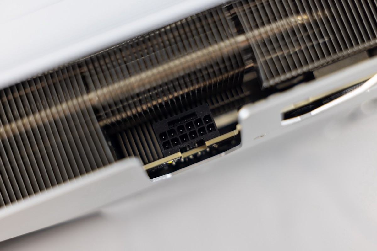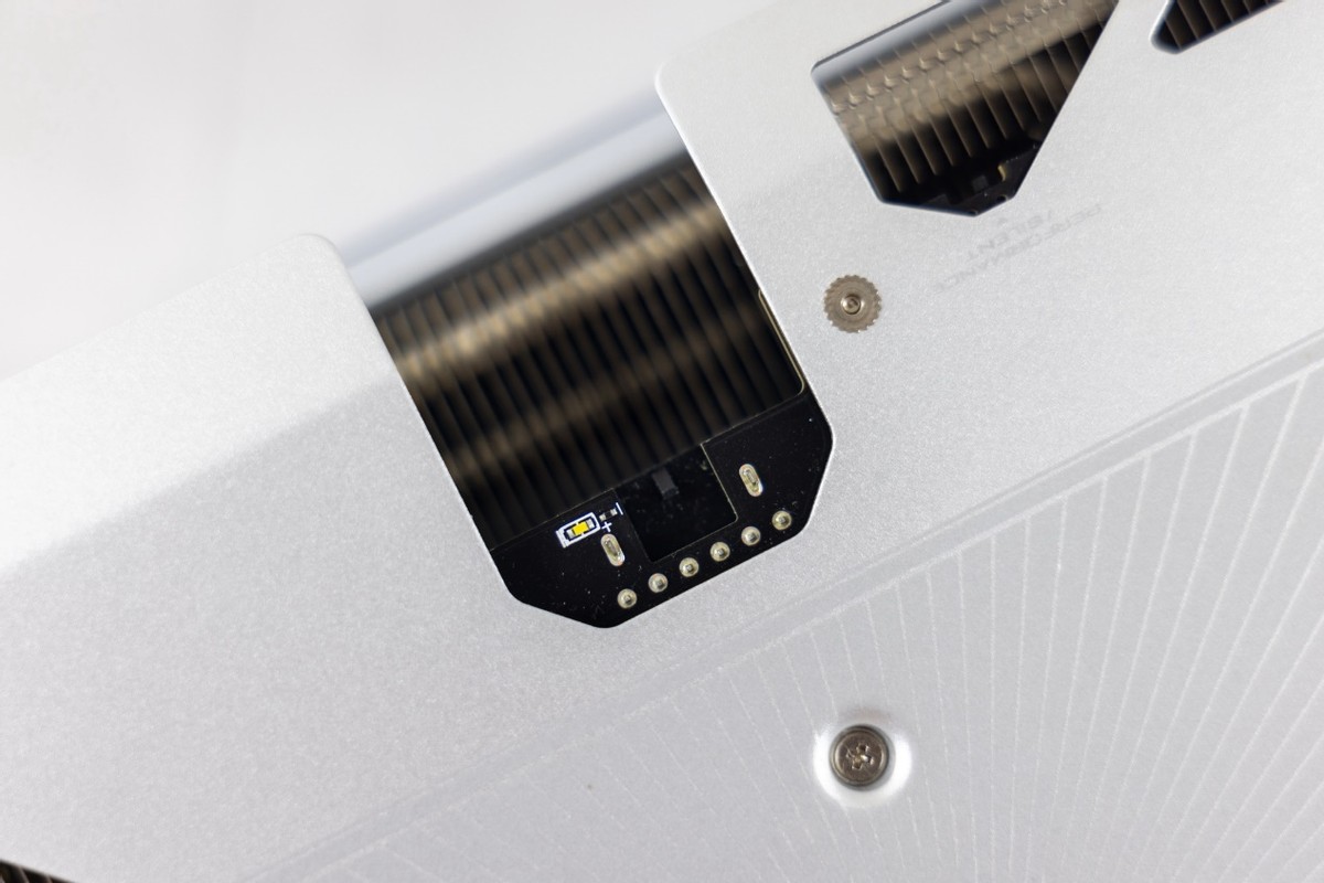 此外从背面可以看到,在供电接口的背面,还设计有一个电源指示灯,这个指示灯在遇到电源异常的时候,会通过闪烁来提醒用户。12V-2x6供电接口从问世以来,烧毁的案例也不算少了,所以我觉得这个指示灯是有用的,不过仅靠指示灯灯光闪烁来提醒,是有些不足的,最好是能联动显卡上的LCD屏幕和系统下的GCC管理软件来提醒会更醒目一些。