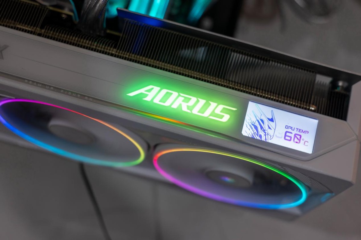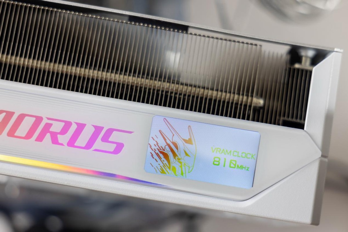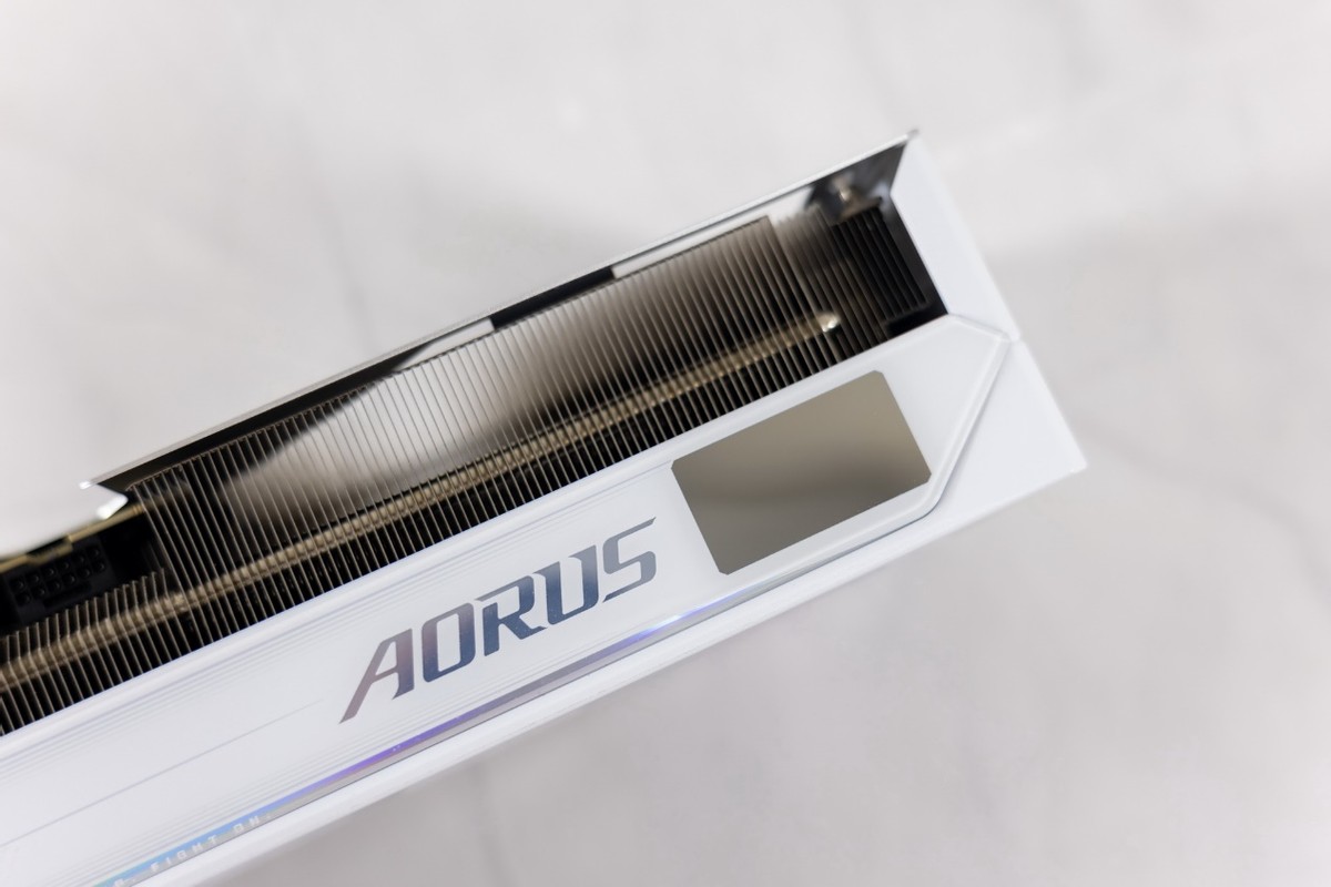 从顶部还可以看到技嘉RTX 5080超级雕ICE的一个亮点设计,就是顶部右侧的LCD显示屏,这个屏幕可以显示显卡信息,还能显示自定义的文本、图片和动图GIF。在屏幕旁边的AORUS系列Logo,具有RGB灯光效果。总体来说,导风罩的设计、做工和质感也是相当优秀。