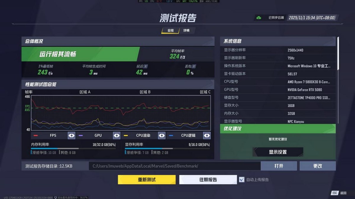 《漫威争锋》,网易游戏运营的超级英雄团队PVP射击游戏,画质最高,测试结果是运行极其流畅,平均帧率324F/S,1% Low帧是243F/S。