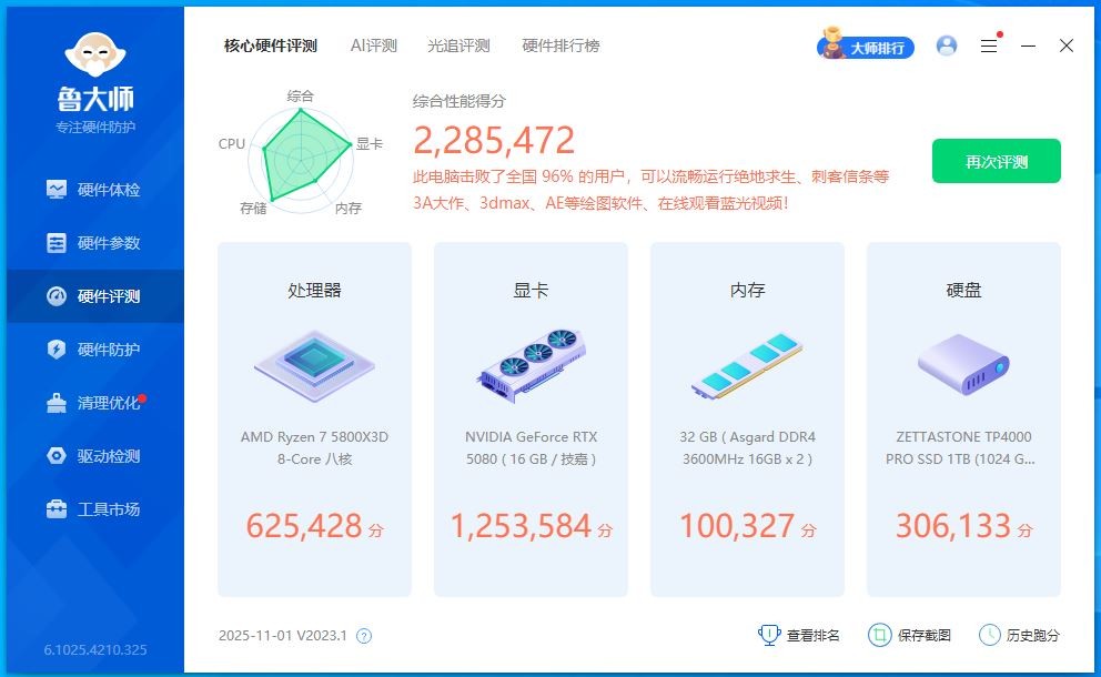 接下来就是跑这个测试软件和游戏来测试技嘉RTX 5080超级雕ICE的性能表现了,以下成绩均是本测试主机在2K分辨率显示器上的测试结果,仅供参考。首先来个娱乐大师开场,总得分2285472,其中CPU 625428,显卡1253584,内存100327,固态硬盘306133。