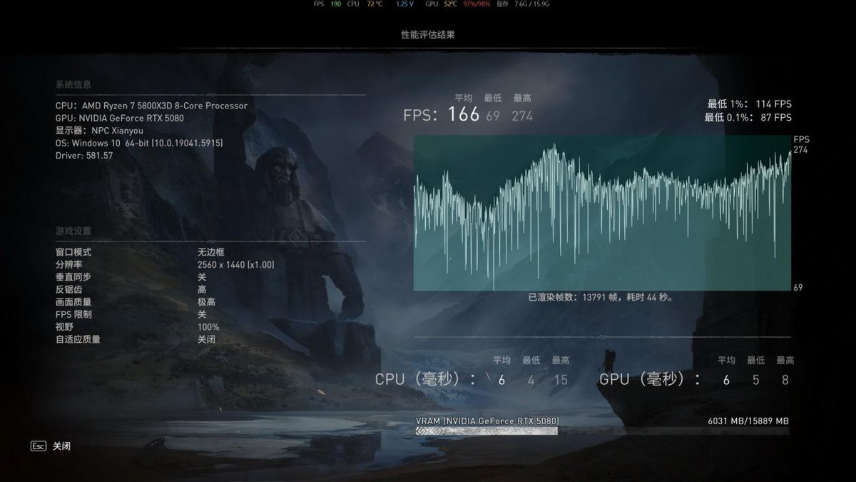 《刺客信条:英灵殿》神话三部曲最后一部,同样不支持光追和DLSS,画质最高,测试结果是FPS平均166,最低69,最高274。1%Low帧114FPS,0.1% Low帧87 FPS。