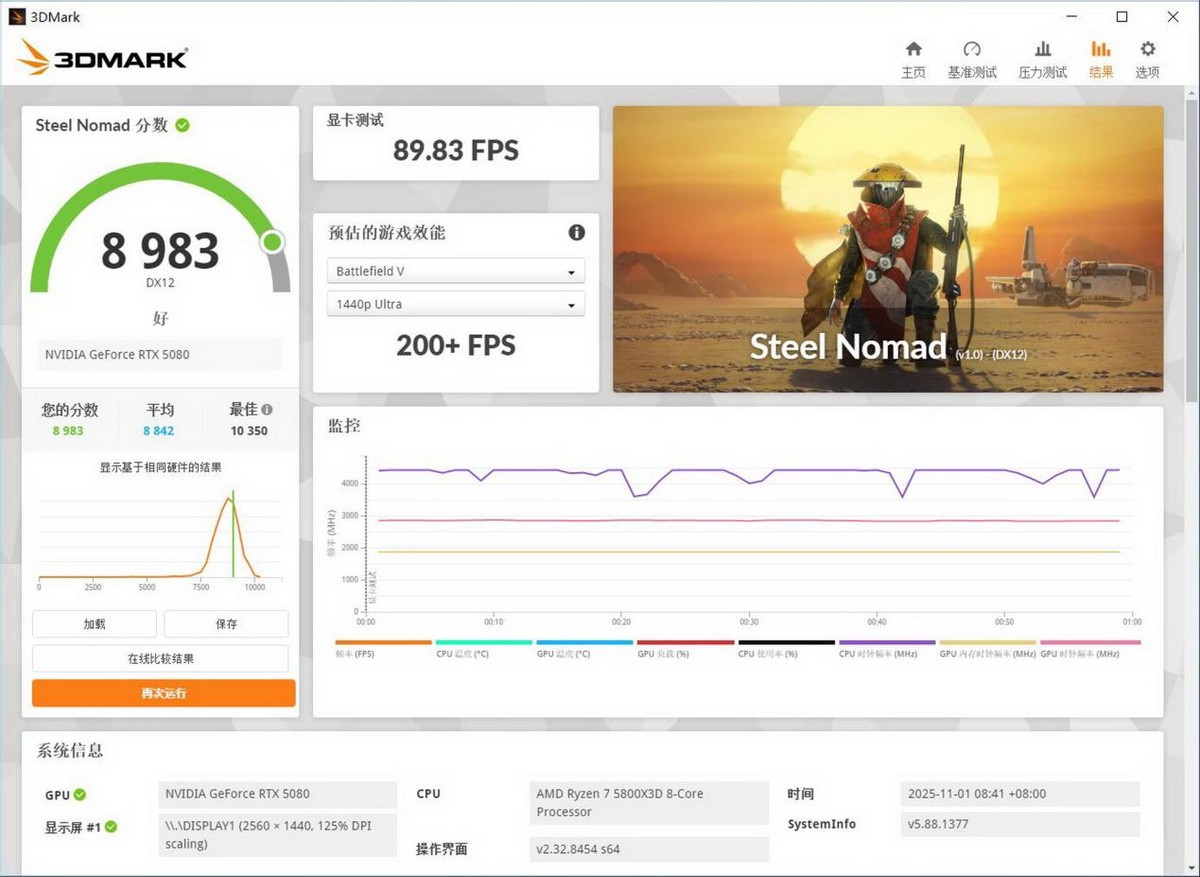 接下来开始跑3DMark的各种测试,首先是Steel Nomad,得分是8983。
