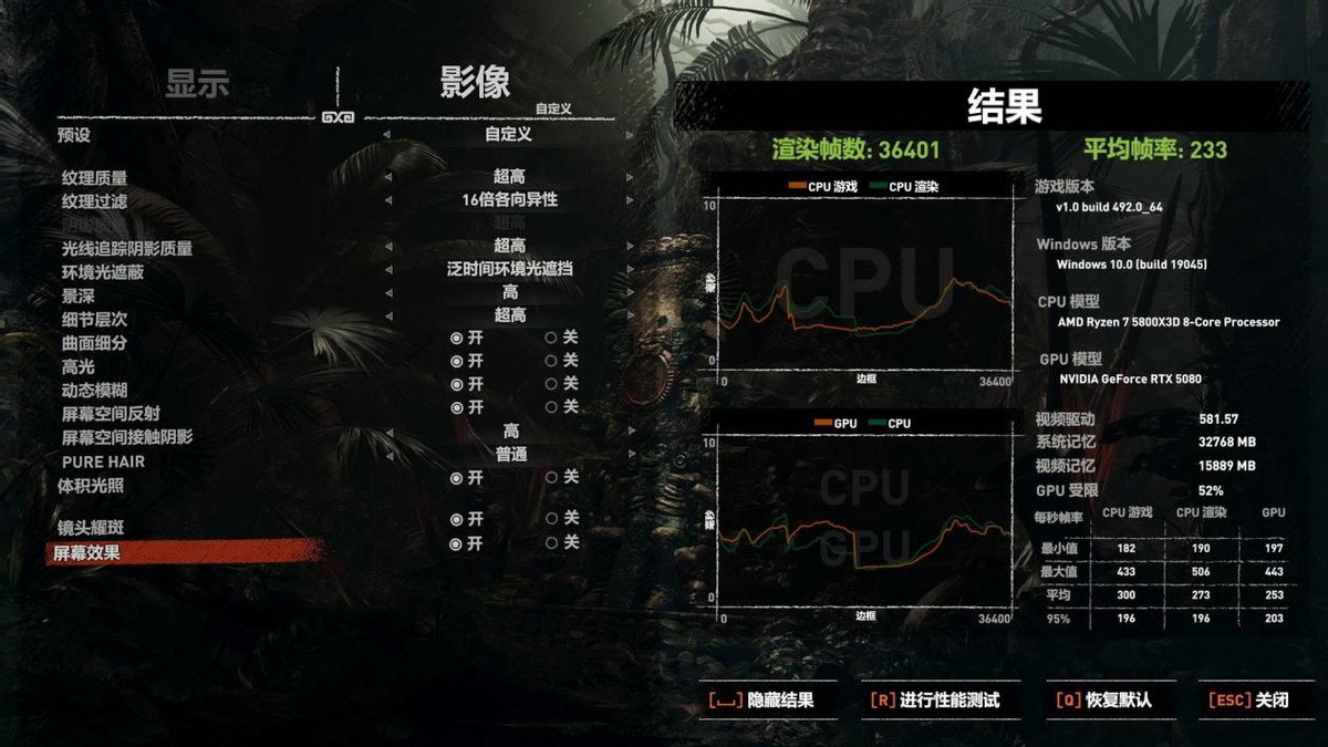 再来是《古墓丽影:暗影》,三部曲最后一作,我非常喜欢的一款游戏,影像也是全部拉到了最高,最终得分是渲染帧数36401,平均帧率是233。
