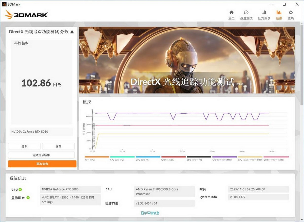 再来就是DirectX光线追踪功能测试,平均帧率是102.86FPS。
