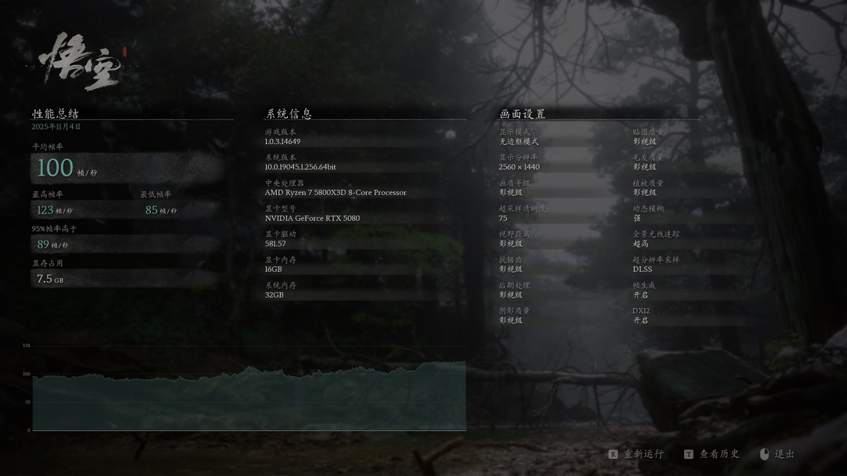 接下来就进行游戏方面的实测,前面的这些游戏都是自身有带Benchmark基准测试的,后面是游戏过程中的截图,在2K分辨率下测试的。首先是国产3A大作《黑神话:悟空》,画面设置全影视级,开始DLSS,开启帧生成,测试结果平均帧率100帧/秒,最高123帧/秒,最低帧率85帧/秒。