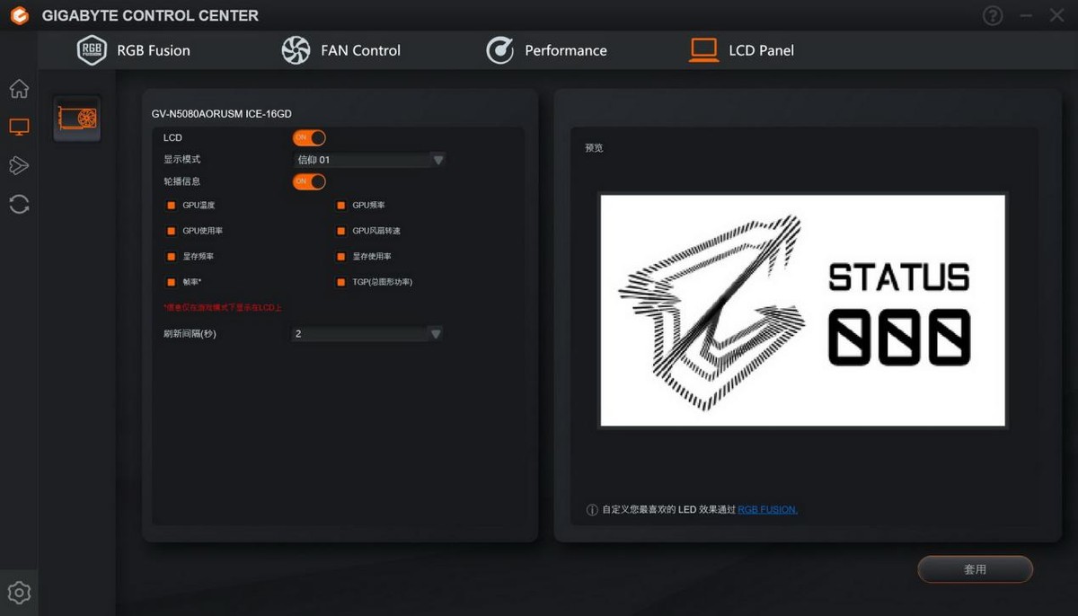 技嘉有个管理软件GCC,在这里可以各设备之间的神光同步,技嘉RTX 5080超级雕ICE除了Logo灯和风扇灯以外,还有个LCD屏幕,也可以通过这个GCC软件管理,在这里可以设置屏幕开关,播放的内容,还可以设定轮播,此外还能上传自定义的文字、图案和GIF动图,很有意思。