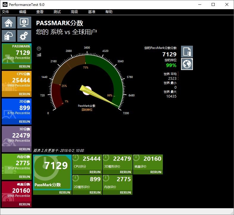 接下来是PassMark的PerformanceTest 9.0,总分是7129,CPU得分25444,2D得分899,3D得分22479,内存得分2775,硬盘得分20160。