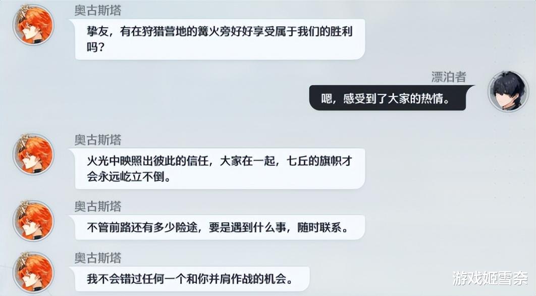 刚离开七丘不久,七丘的大家都还沉浸在击败鸣式的喜悦中,嘉贝莉娜跟漂子更偏向战友情,飞讯说自己接着去狩猎,不过因为有黑海岸的黑花现在有了归宿安心了很多,跟嘉贝莉娜类似的还有忌炎和奥古斯塔,还好忌炎没说要我回去赛咕咕河豚,只是在单纯的为今州平安出大力的我们表达感谢。奥古斯塔告诉我们无论我们在哪七丘都是你的靠山,都哥们有事就叫我!