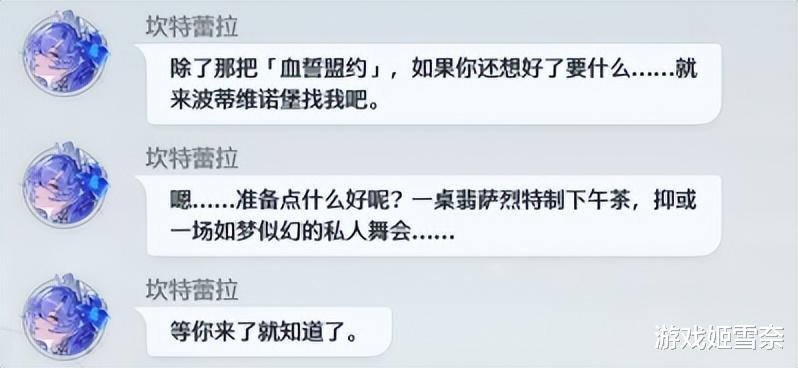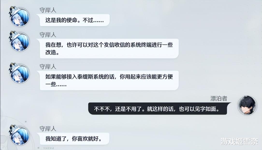 到蓝人机这边大老婆果然还是有特殊待遇的,岸宝说自己愿意继续守候在黑海岸等漂子出去冒险回来听咱们给她讲故事,然后岸宝突发小巧思——也许是蓄谋已久的说要给飞讯进行改造直接连接泰提斯,哎呦,别,这样我还怎么跟女孩子聊天?岸宝要视奸我?真接到泰提斯怕不是刚跟其他妹妹聊两句屏幕一红蹦出来跟“我在看着你”,好恐怖啊!是因为最近往黑海岸带后宫太频繁了惹岸宝生气了吗?给漂子吓得连打三个“不”,而且岸宝讲话真的好像病娇,说完你喜欢就好又接了一个超级FLAG说以后请让我和你走下去,已经开始背后冒汗了。