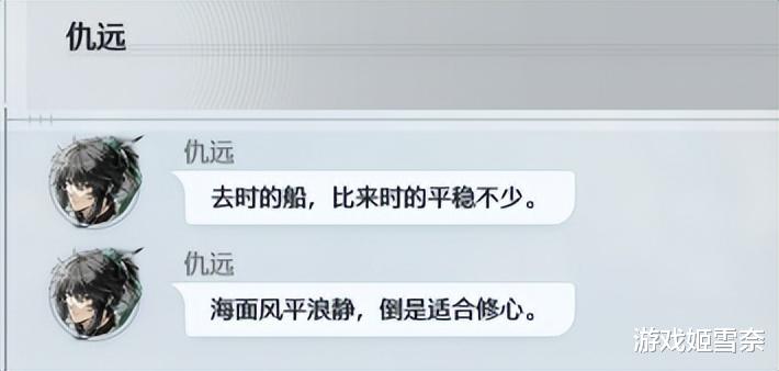 还有仇远,见面的时候就惜字如金,飞讯上也还是惜字如金,总共就两句话还得琢磨琢磨他的话里有话,说是去时的船比来时平稳,那是因为来时仇远身上有任务,且对黎那汐塔的情况尚不明了心里有事,走时安稳因为漂子已经解决了问题并且给仇远做出承诺,所以后半句说是海面风平浪静,其实是指仇远自己已经安心了吧~