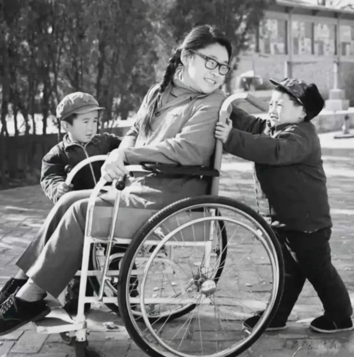 上图是1983年,坐在轮椅上的张海迪,回头看向帮她推轮椅的小朋友!