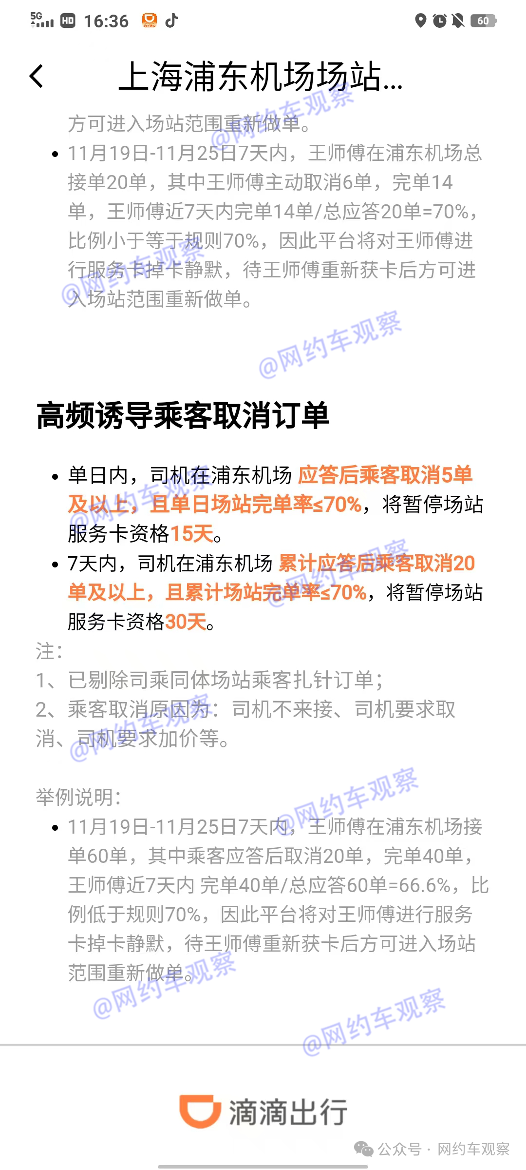 一天内,司机主动取消乘客订单量大于2单或者场站完完单率≤70%,将暂停场站服务卡资格7天。一周内司机累计取消乘客订单量>4单,且累计场站完单率≤70%,将暂停场站服务卡资格15天。