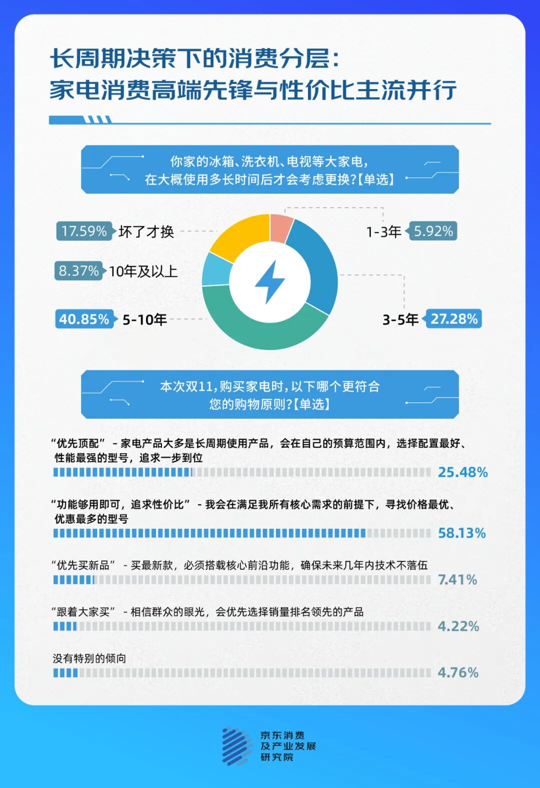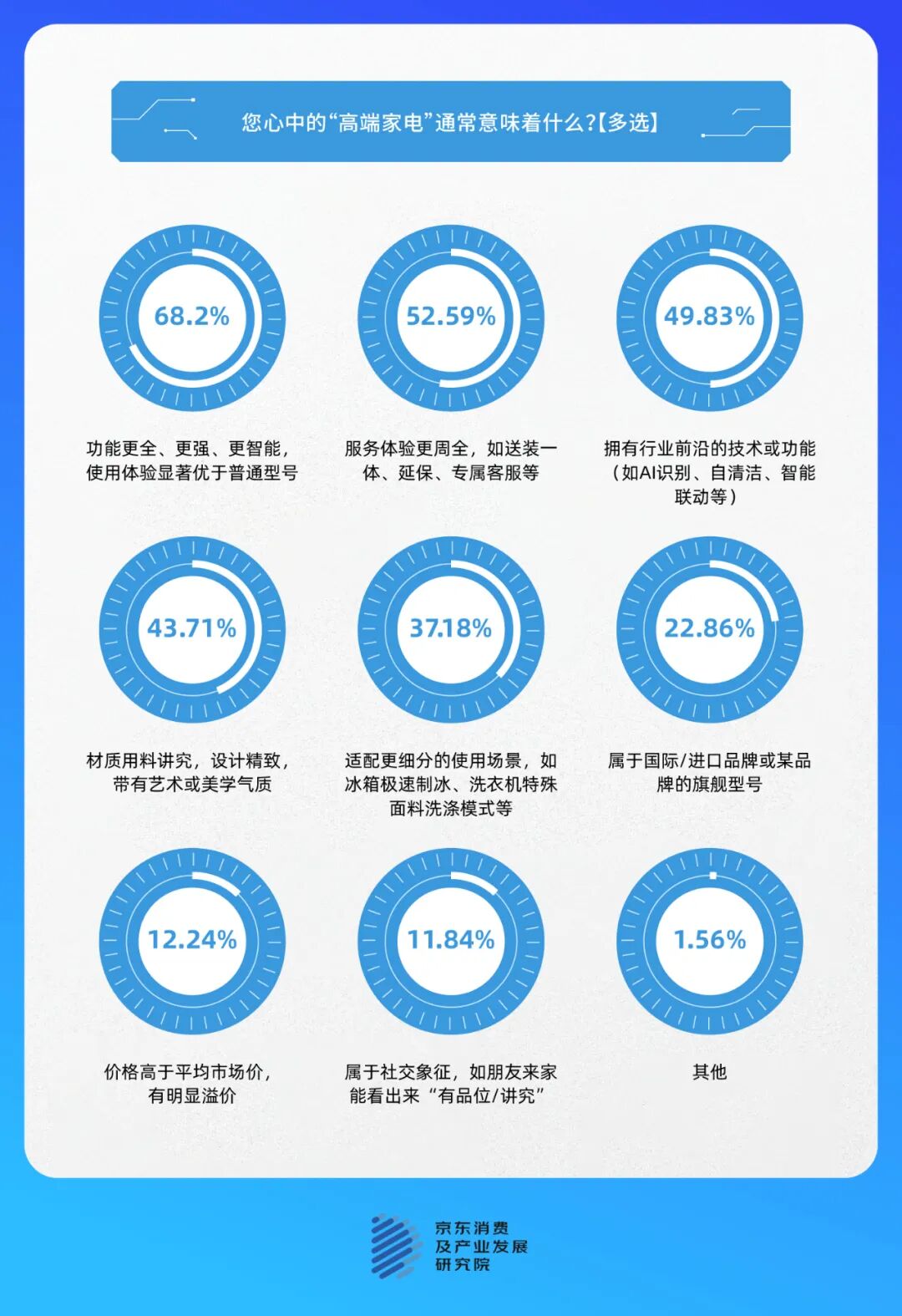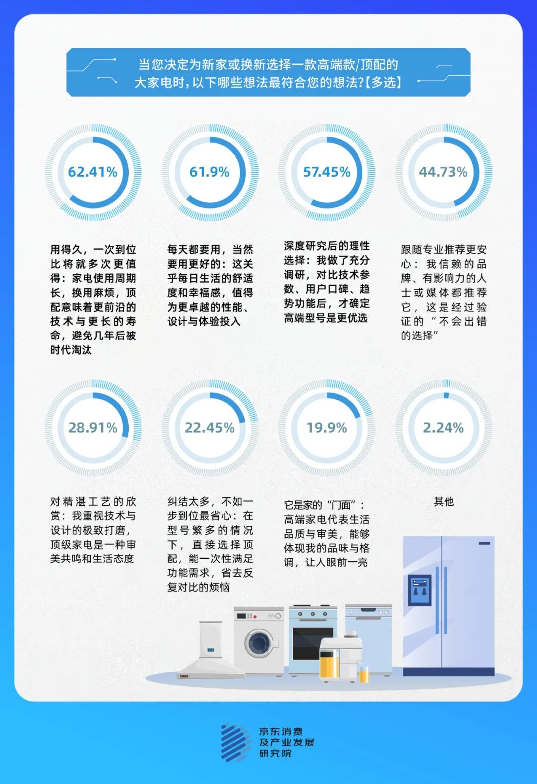 京东调研结果显示,62.4%的消费者认为“高端家电用得久,一次到位比将就多次更值得。家电使用周期长,换用麻烦,顶配意味着更前沿的技术与更长的寿命,避免几年后被时代淘汰”;61.9%的消费者认为“每天都要用,当然要用更好的:这关乎每日生活的舒适度和幸福感,值得为更卓越的性能、设计与体验投入”;57.5%的消费者表示选择高端型号是“深度研究后的理性选择:做了充分调研,对比技术参数、用户口碑、趋势功能后,确定高端型号是更优选”。