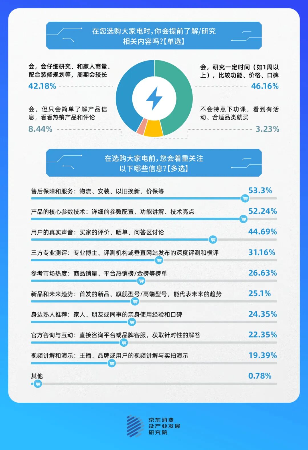 调研统计显示,在购前的“研究”阶段,超八成的消费者会在京东查看销量榜单、用户评论、功能参数等信息;这一比例远高于小红书(37.5%)、抖音(35.3%)等内容平台。