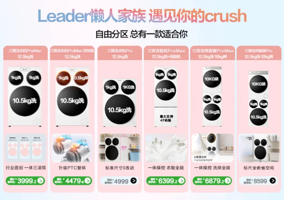 海尔更是听劝式研发,直接官宣旗下年轻厂牌Leader的三筒懒人洗衣机。京东销售数据显示,海尔Leader三筒懒人洗衣机上线4个月销量破10万台,这证明了“强需”和“分需”的巨大价值。平台敏锐捕捉到用户对洗衣机的需求不只是洗干净衣服,而是分场景、精细护理、能烘干,再将需求传导到行业创新端。