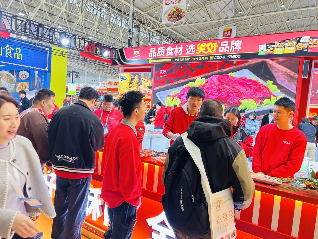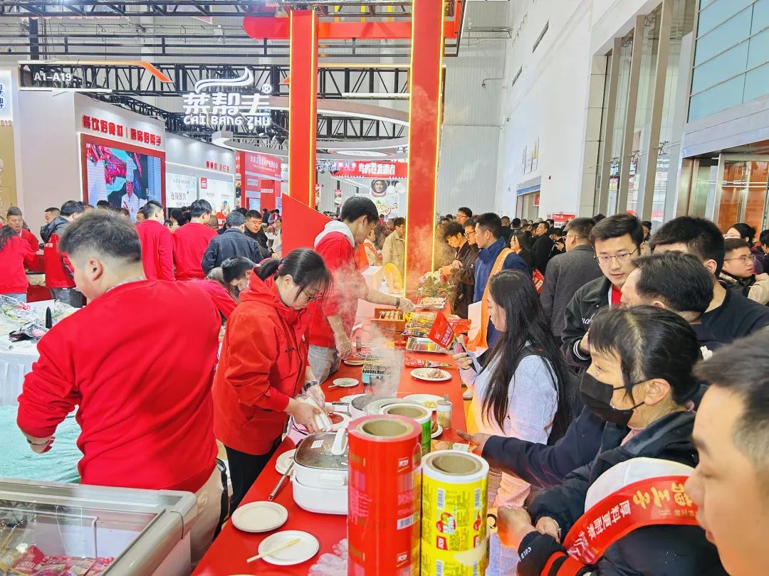 3月29日下午,良之隆展会A1馆A17美好食品的展位格外亮眼。展位以喜庆的大红色为主色调,熙熙攘攘的观众围在展位上洽谈交流、品尝美食。