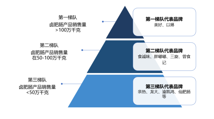 第一梯队以年销售量达到100万千克以上为门槛,包括了新希望美好和河北以琳食品。其中,美好卤肥肠产品销量为600万千克,全国销量排名第一。