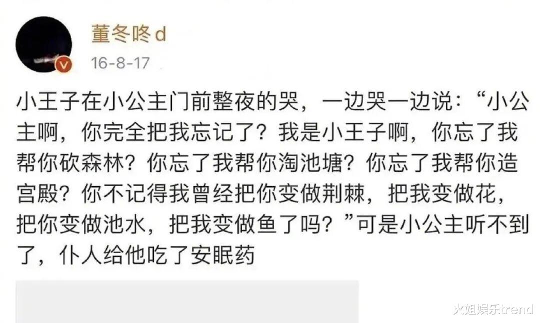 一句这是我的朋友董子健,礼貌疏离克制,就把他们曾经让人羡慕的爱情和婚姻隔开一道银河。翻看他们早期的互动,董子健简直把孙怡宠爱成了小公主,孙怡说自己是小公主,董子健就说自己是小王子。