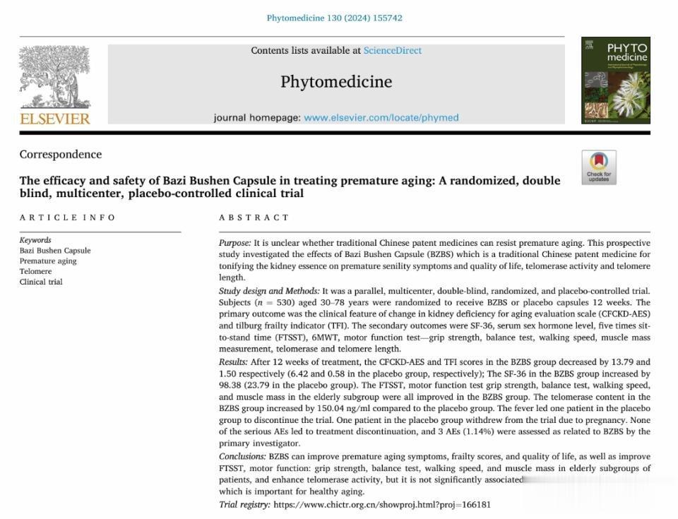 循证医学:科学解码中医药抗衰实效中医药的传承与结合,关键在于“说明白、讲清楚”。发表于国际权威期刊《植物医学》(Phytomedicine)的一篇名为《八子补肾胶囊治疗早衰的疗效和安全性-随机、双盲、安慰剂对照、多中心临床研究》的论文,为中药干预衰老提供了严谨的量化证据。