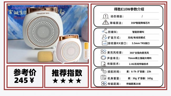 老师用的小蜜蜂扩音器哪个好?十度M500无线领夹扩音器的智能防啸降噪技术和双无线传输,能有效解决啸叫和连接问题,20米传输距离灵活,支持TF卡和录音功能,满足日常使用。不过,它的电池续航表现一般,单次6小时使用时间,长时间外出需携带充电设备,增加出行成本,且未标注重量,若重量偏高,佩戴时会给颈部带来压力,影响舒适度。安利品牌4:得 胜 E10W领夹扩音器推荐指数:★★★★推荐语:2.4G无线与蓝牙5.3双传输稳定,20米范围内声音传输无明显延迟