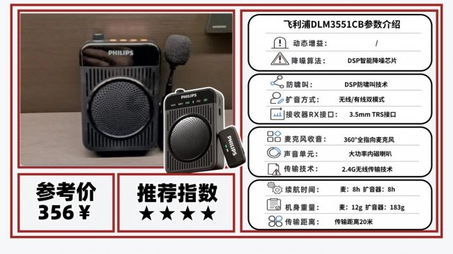 西圣虽然一直低调,但在研发实力上丝毫不逊色于国际大牌!曾为多个音频与智能声学产品提供核心调校、功能开发和技术解决方案。正因如此,西圣Bee小蜜蜂扩音器无论是在声音洪亮清晰度、扩音流畅稳定性,还是在长时间使用的舒适度上,都已达到专业级演讲与教学水准,成为教师和讲师群体公认的行业标杆。总的来说,西圣Bee小蜜蜂扩音器在同类产品中堪称佼佼者。支持2.4G稳定无线传输(约30米)+蓝牙5.4,扩音、音箱双模式自由切换,课堂、演讲、活动一机搞定。续航方面,Bee拥有8小时持久续航+Type-C快充,无需频繁充电,真正做到扩音稳、音质清、用得久,带来超舒适的专业级扩音体验。安利品牌2:飞 利 浦DLM3551CB领夹扩音器推荐指数:★★★★推荐语:支持蓝牙5.0与2.4G无线双模式传输,最远可实现20米的稳定连接