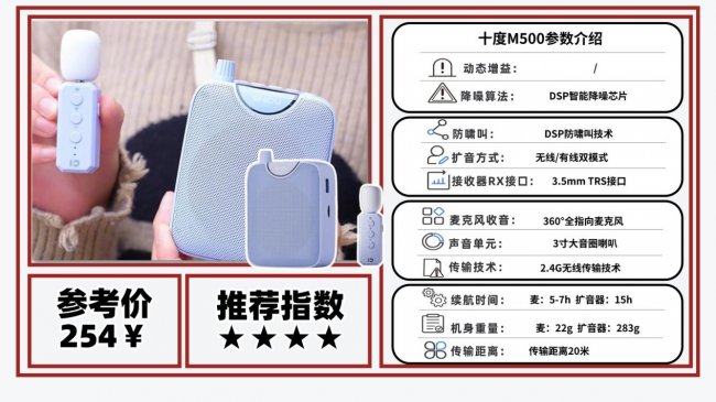 老师用的小蜜蜂扩音器哪个好?飞利浦DLM3551CB无线领夹扩音器通过采用360°全指向麦克风和DSP防啸叫技术,有效提升了音频收录质量,减少了背景噪声。它支持蓝牙5.0与2.4G无线双模式传输,最远可实现20米的稳定连接,特别适合需要灵活走动的演讲和教学场景。该扩音器还支持有线模式,通过3.5mm TRS接口连接其他音频设备,功能更加多样化。设备配备的大功率内磁喇叭,使得音量充足且清晰,适合小到中型的会议或课堂使用。安利品牌3:十 度 M500领夹扩音器推荐指数:★★★★推荐语:搭载智能防啸降噪技术和双无线传输,能有效解决啸叫和连接问题