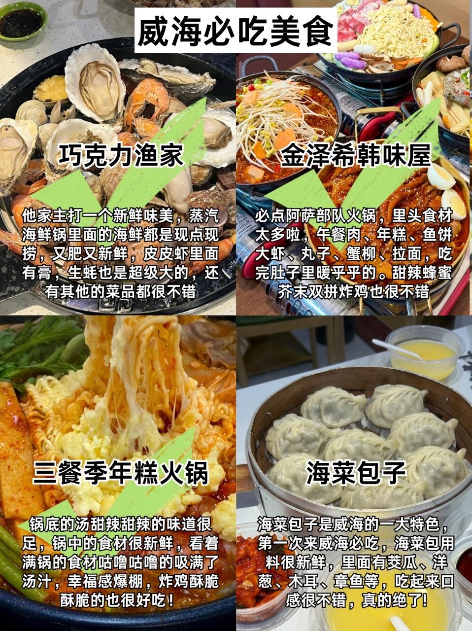 🐟 巧克力渔家必去❗主打活海鲜,明档现捞。海鲜蒸汽锅必点,贝类和虾🦐都是活的直接蒸,蘸点酱油就鲜甜。海肠捞饭分量足,口感脆脆的。整体是家常菜味道,性价比很高👍🏻!想吃韩餐就去✅金泽希韩味屋和✅三餐季年糕火锅,这两个店的味道都很正宗,可以去尝一尝🥰!还有✅海菜包子是威海的特色美食,第一次去威海一定要试试,皮薄馅大真的绝了!