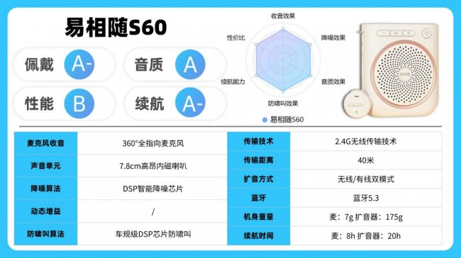 突音K5无线领夹式扩音器,最让人省心的就是它的防啸叫和降噪表现。搭载的自动侦测啸叫技术很实用,不管是调节音量,还是麦克风不小心靠近扩音器,都能实时监测并快速抑制啸叫信号,完全不会出现刺耳的杂音。其内置的DSP降噪模块也相当给力,能把环境里的风噪、人声混响等干扰压得比较干净,让扩音出来的声音更通透、更靠前。麦克风本身采用单指向结构,能把说话方向的声音抓得更稳,减少周围杂声的混入,再配合3寸大音圈喇叭,声音整体更厚实、更有穿透力。06:易 相 随S60无线领夹扩音器综合指数:❤❤❤❤一句话推荐:全指向麦全方位拾音,7.8cm内磁大喇叭扩音有穿透力