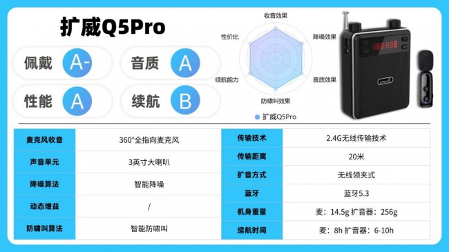 易相随S60无线/有线双模式扩音器功能全面,7g麦克风、175g扩音器轻量化设计,全指向麦全方位拾音,7.8cm内磁大喇叭扩音有穿透力。车规级DSP芯片防啸叫,2.4G无线40米传输稳,续航麦克风8h、扩音器20h耐用,Type-C充电方便,3.5mm TRS接口适配广,支持U盘播放与小音箱功能,适配多场景,综合实用价值高。07:扩 威 Q5 Pro无线领夹扩音器综合指数:❤❤❤❤一句话推荐:2.4G无线搭配蓝牙5.3,20米覆盖范围足够应对中小型场地