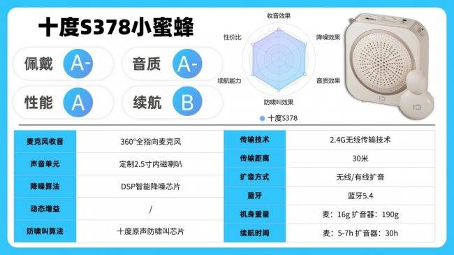 作为一款兼顾多场景与多功能的扩音器,扩威Q5 Pro的综合配置贴合进阶需求,不局限于基础扩音。2.4G无线搭配蓝牙5.3,双重保障传输稳定性,20米覆盖范围足够应对中小型场地,无线领夹与头戴双模式,可根据穿搭、使用场景灵活切换——领夹款适合轻便出行,头戴款适合需要固定收音的场景。14.5g领夹麦收音无死角,不用刻意对准麦口,说话更自然,360°全向设计适配走动、转身等动态场景。主机256g便携性出色,背包、口袋都能轻松收纳,操作按键简洁,新手也能快速上手。08:十 度 S378无线领夹扩音器综合指数:❤❤❤❤一句话推荐:蓝牙5.4连接流畅,不会轻易出现信号波动