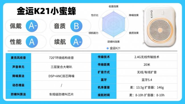 金运K21在扩音设备中优势明显,13.5g麦克风超轻,领夹佩戴不压颈;146g扩音器轻便,携带轻松。无线领夹/有线双模式应对不同场景,720°环绕收音全方位收录人声。顶配三层复合大喇叭声音饱满,进口DSP+ANC双芯过滤杂音,车规级防啸叫芯片防啸叫。2.4G无线40米传输稳,续航8-10小时。Type-C充电方便,接口兼容广,模式丰富。05:突 音 K5无线领夹扩音器综合指数:❤❤❤❤一句话推荐:3寸大音圈喇叭,声音整体更厚实、更有穿透力